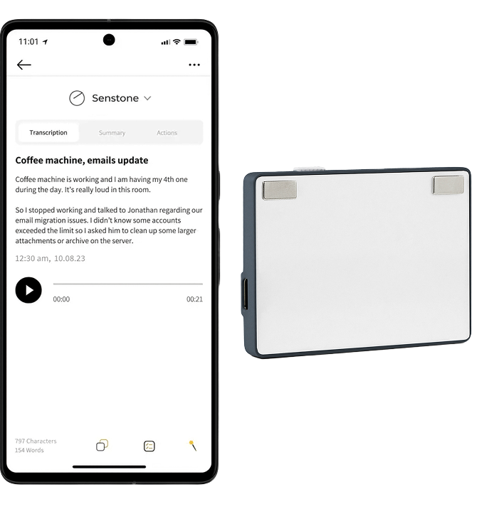 The Audio Badge records workpplace conversations clearly and turns them into useful summaries. It's lightweight and discreet - perfect for meetings. I don't take manual notes anymore.